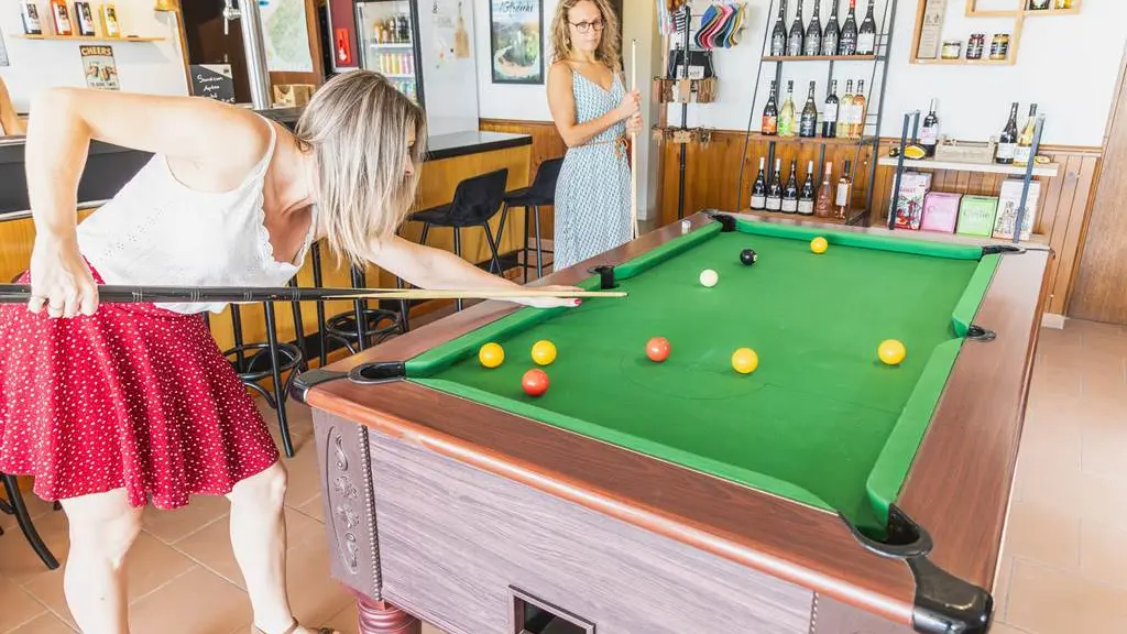 For entertainment, there is a play area with swings and slides, 2 ping-pong tables, a pétanque court, a meadow with football goals, an area with a basketball hoop, a fitness room (for adults only), and at the refreshment bar a pool table and table football.